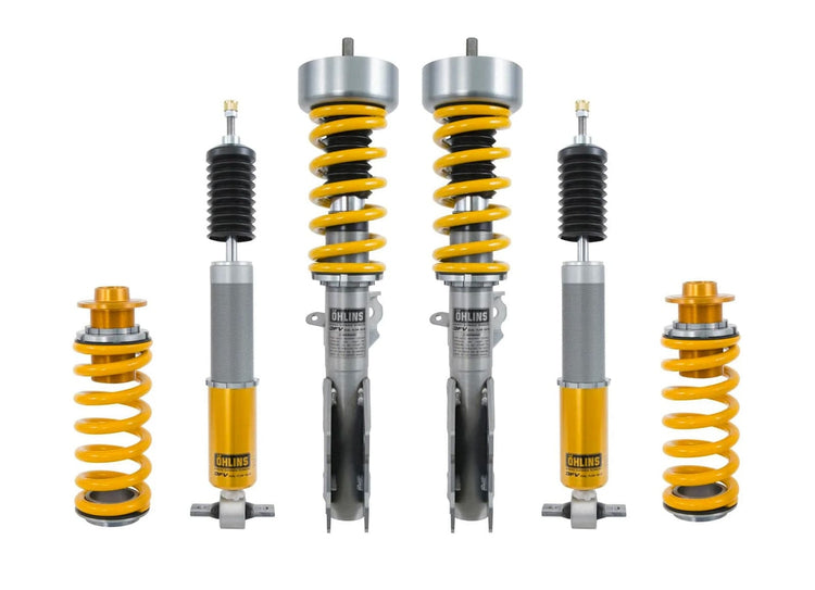 The Ohlins Road & Track coilovers give your 2015-2023 Ford Mustang (S550) a true racing experience without losing comfort when commuting to work. Our unique Dual Flow Valve (DFV) technology allows you to quickly change the stiffness of the shock absorber. When arriving to the racetrack, just turn the golden knob clockwise on the damper to set it in race mode this action changes all four areas in the damper; low and high speed compression and rebound damping.