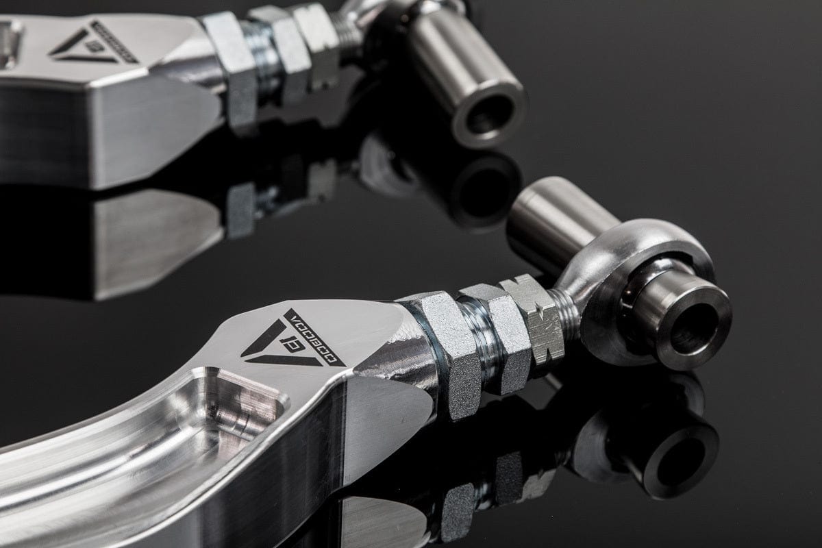 Voodoo13 S13/Z32/R32 GTS Front Adjustable Tension Rods are designed and engineered specifically for optimized shape and geometry for maximum steering angle. Precision CNC machined body from high strength 6061-T6 aluminum coated in MIL-A-8625 Type III Hard Anodize, CNC’d chromoly hardened steel adjuster, stainless steel CNC machined spacers and Grade 8 hardware are used to ensure they will withstand abuse from street cars and track cars alike.