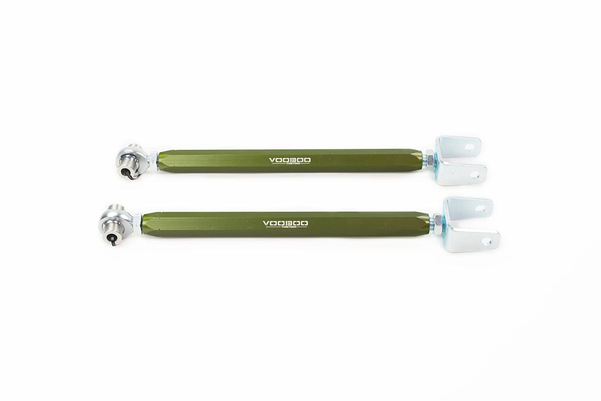Voodoo13 Nissan 350Z Rear Adjustable Toe Arms are designed, engineered, and tested on race tracks across the globe using feedback of top tier drivers and technical directors. Precision CNC machined adjusting rod from high strength 6061-T6 aluminum coated in MIL-A-8625 Type III Hard Anodize, CNC laser cut and bent steel brackets with TIG welded construction and stainless steel CNC’d spacers are used to ensure they will withstand abuse from street cars and track cars alike.
