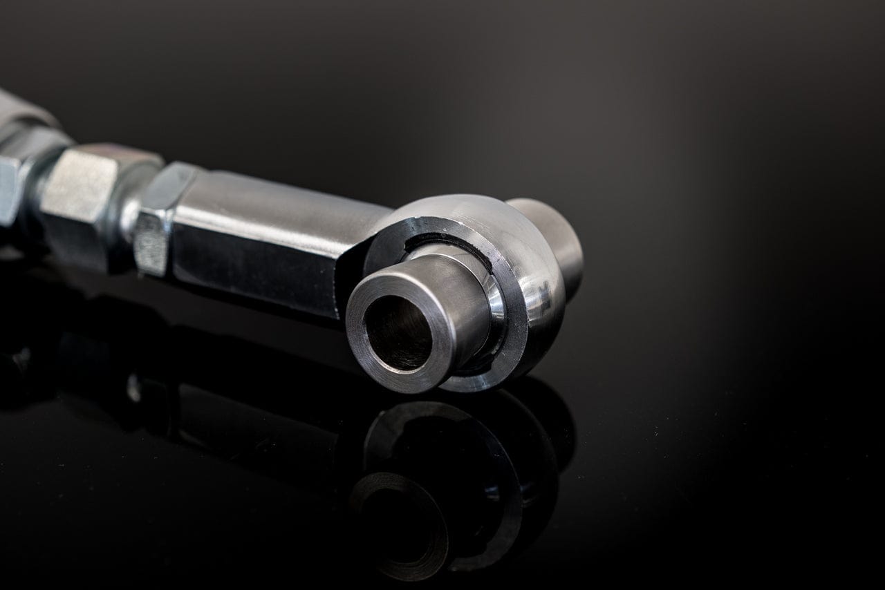 Voodoo13 adjustable rear toe arms for the 2015+ Ford Mustang give you the adjustability needed to get your toe back to spec after you’ve lowered your car. Our arms are engineered and designed for high performance street and race vehicles. They replace the soft rubber OE bushings with rigid spherical bearings for increased handling and performance, but may sacrifice noise and comfort compared to arms that use rubber bushings.