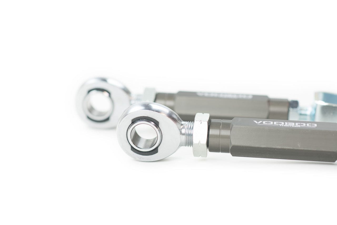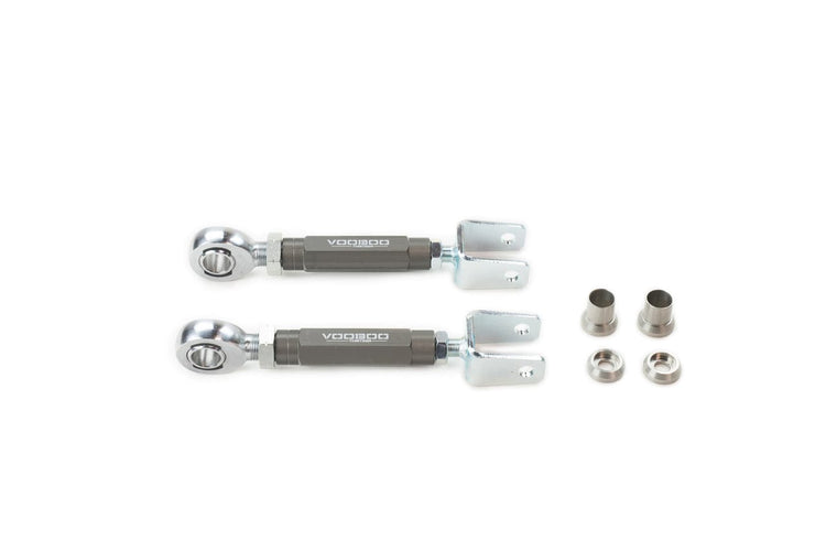 Voodoo13 Adjustable Rear Traction Arms for the 2008-2013 Infiniti G37 RWD replace the OE arms which use rubber bushings which over time wear out and can adversely affect toe change under extreme acceleration and braking. The bumpsteer curve can be adjusted by changing the length of the traction rods.